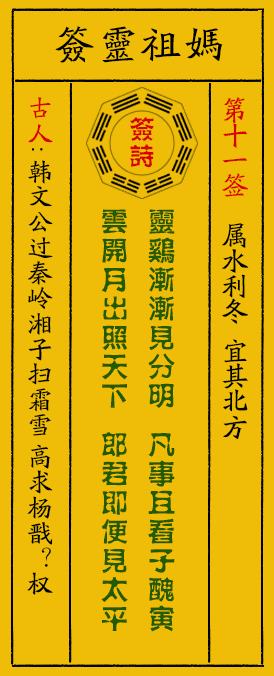 【台湾北海观音明善堂】灵鸡一啼,天渐渐亮了,凡事就看明天了。云开月出,佛光普照天下,太平景象即将呈现眼前了。这首签诗的灵鸡(酉)可以当作农历八月解释。子丑寅为十一,十二和正月。意思是,黑夜过去了,鸡一啼,黎明就接着来了。一个人一生不会都走霉运的,当时来运转,正如“云开月出”,必定会有一番新气象。求得此签暗示目前福报尚有不足。问事求谋,宜求神明祈福可得圆满。问做事求财,可以说渐渐有希望。这首签诗是苦尽甘来之兆,所以问功名,表示你十年寒窗,有出头的日子了。问婚姻,表示有情人终成眷属。移居平安,出外可行。问疾病,病情加重,元辰暗淡有五鬼阴邪作祟、病拖尾,宜消灾。 【台湾育德妈祖同修会】灵鸡一啼天渐渐亮了,凡事就看明天吧!云开月出,光照天下,你便可看到太平景象了!这首签诗的寓意是,黑夜过去了,鸡一啼,黎明就接着来了。一个人一生不会都走霉运的,当那时来运转,正如“云开见月出”,会有一番新气象出现的!抽到此签,如问做事求财,可以说渐渐有希望了。灵鸡(酉)可以当八月解释,就是说八月以后,渐渐有希望了。子、丑、寅可以当作年尾(十一月、十二月)和明年(正月)解(当然也可以当作子、丑、寅日解)。这首签诗是苦尽甘来之兆,所以问功名,表示你十年寒窗,有出头日子了。问婚姻,表示有情人终成眷属。移居平安,出外可行。 |